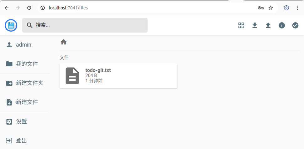 浏览器访问 http://localhost:7041, 如下是主界面,显示当前的文件列表,双击文件名打开编辑器来显示内容。右上角有上传、下载按钮。