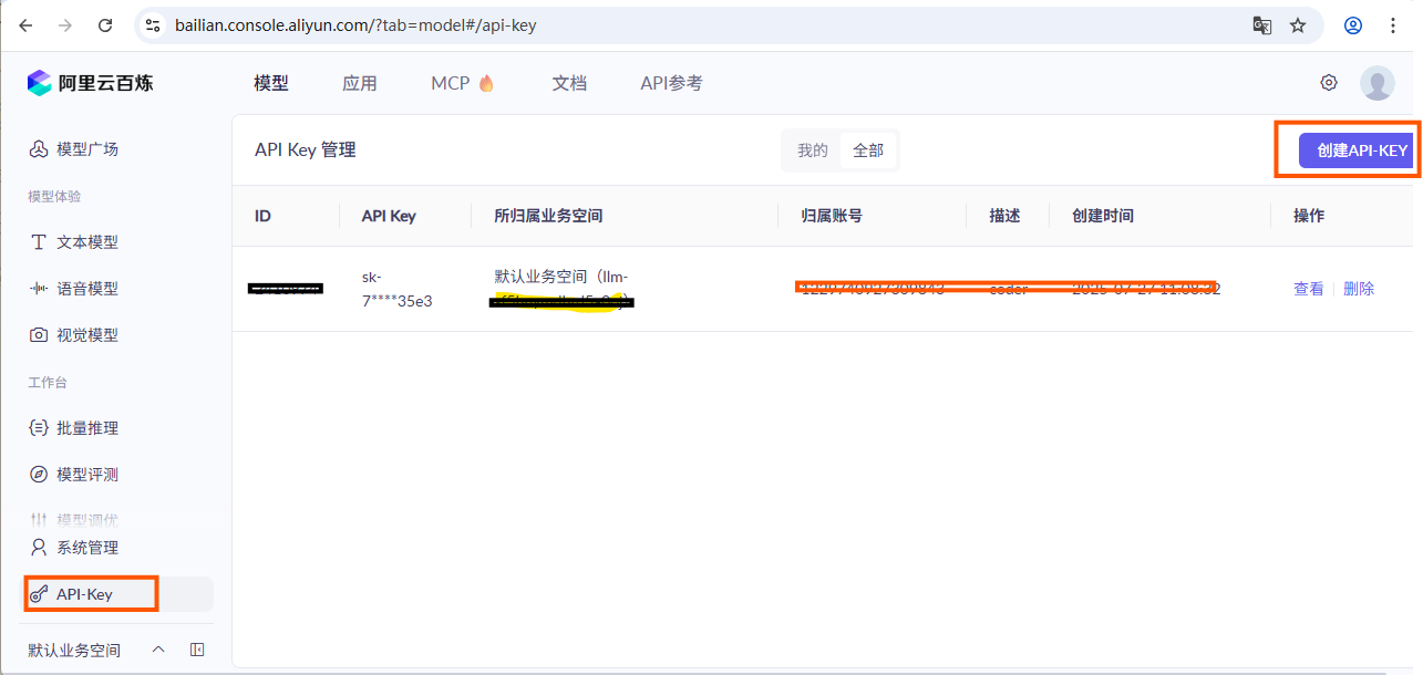 阿里云百炼平台上API-Key菜单下管理token, 可以通过右上角的[创建API-KEY]按钮来创建key: