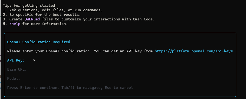 按照Qwen Code在Github的readme描述,在国内使用需要设置如下3个环境变量。其中OPENAI_BASE_URL与OPENAI_API_KEY为OpenAI API兼容的服务路径与对应的token, OPENAI_MODEL为使用的模型,显示的是Qwen3 Coder。可以使用阿里云百炼平台的免费额度或者ModelScope每天2000次的免费额度。